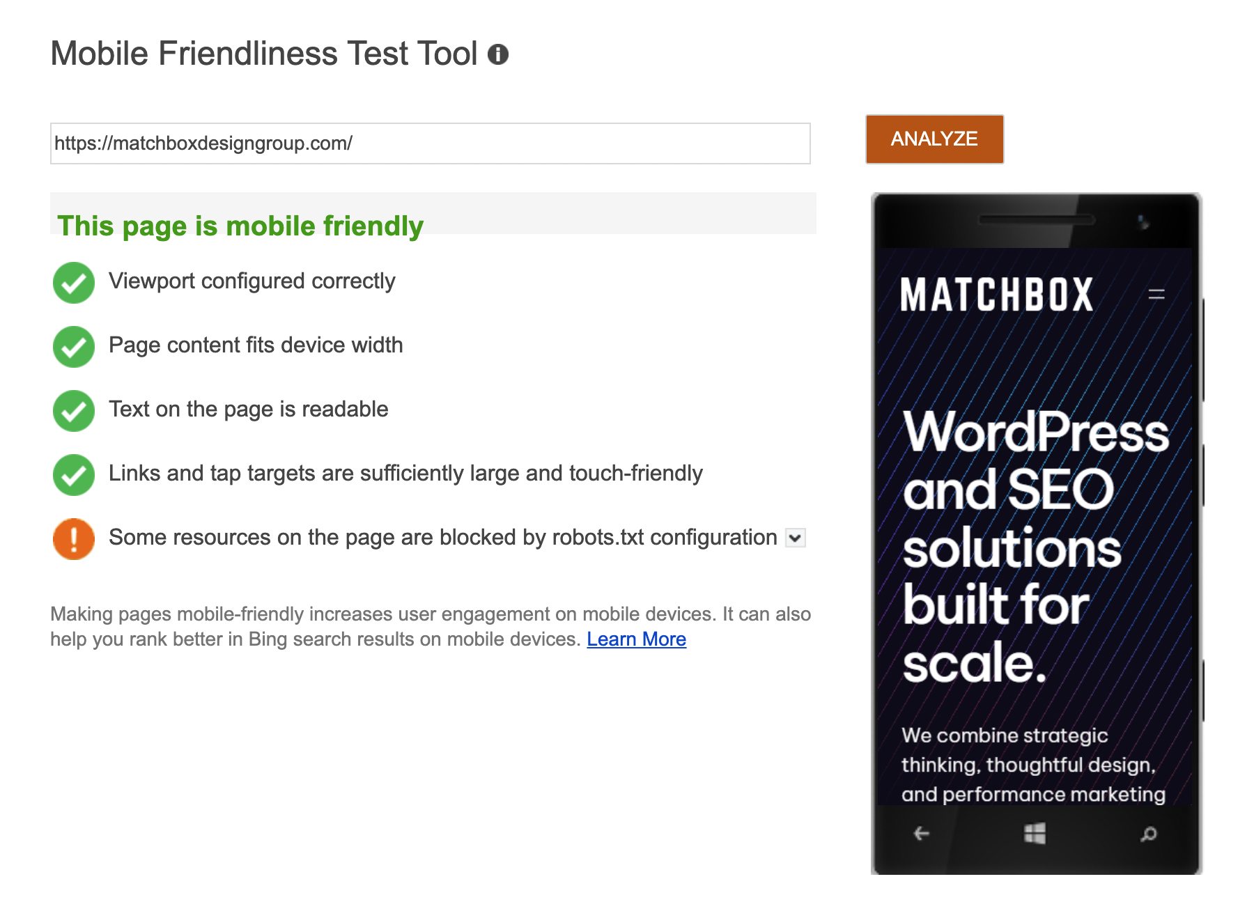 What it is: Bing’s free tool checks how well your site performs on mobile devices according to Bing’s standards.
