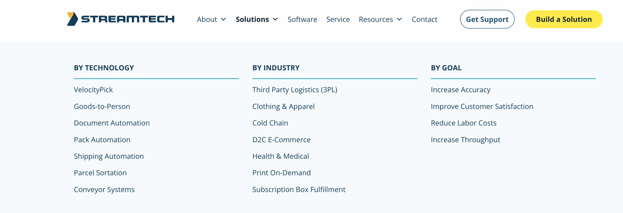 On StreamTech’s previous site, the “Solutions” section was organized by broad fulfillment stages—Pick, Pack, Sort, Ship, and Control. While this structure made sense internally, it was often confusing for users who weren’t deeply familiar with warehouse automation terminology.